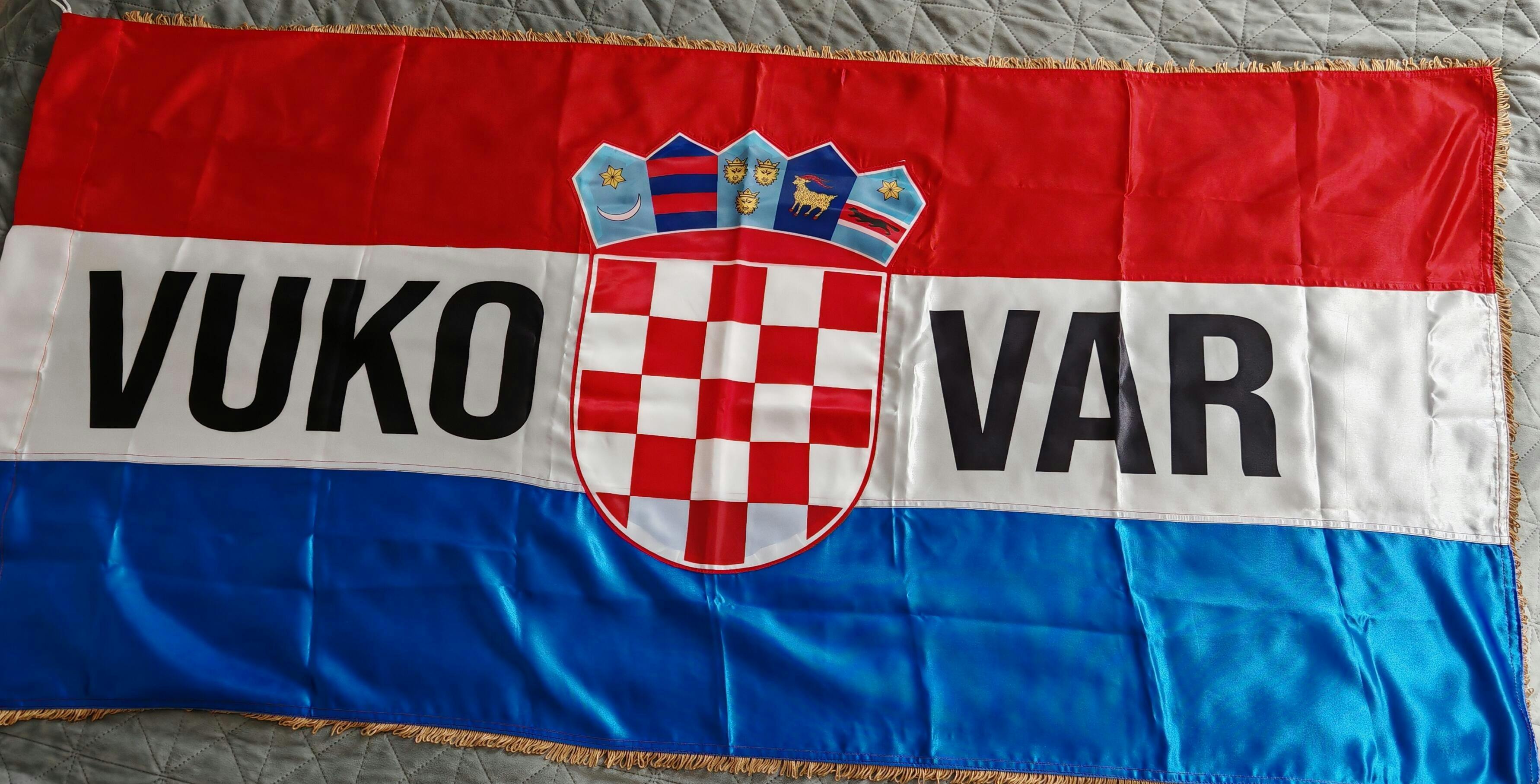 - Svilena hrvatska zastava sa šivanim grbom s obje strane, otvorom za štap te našivenom trobojnicom promjera 6 mm.