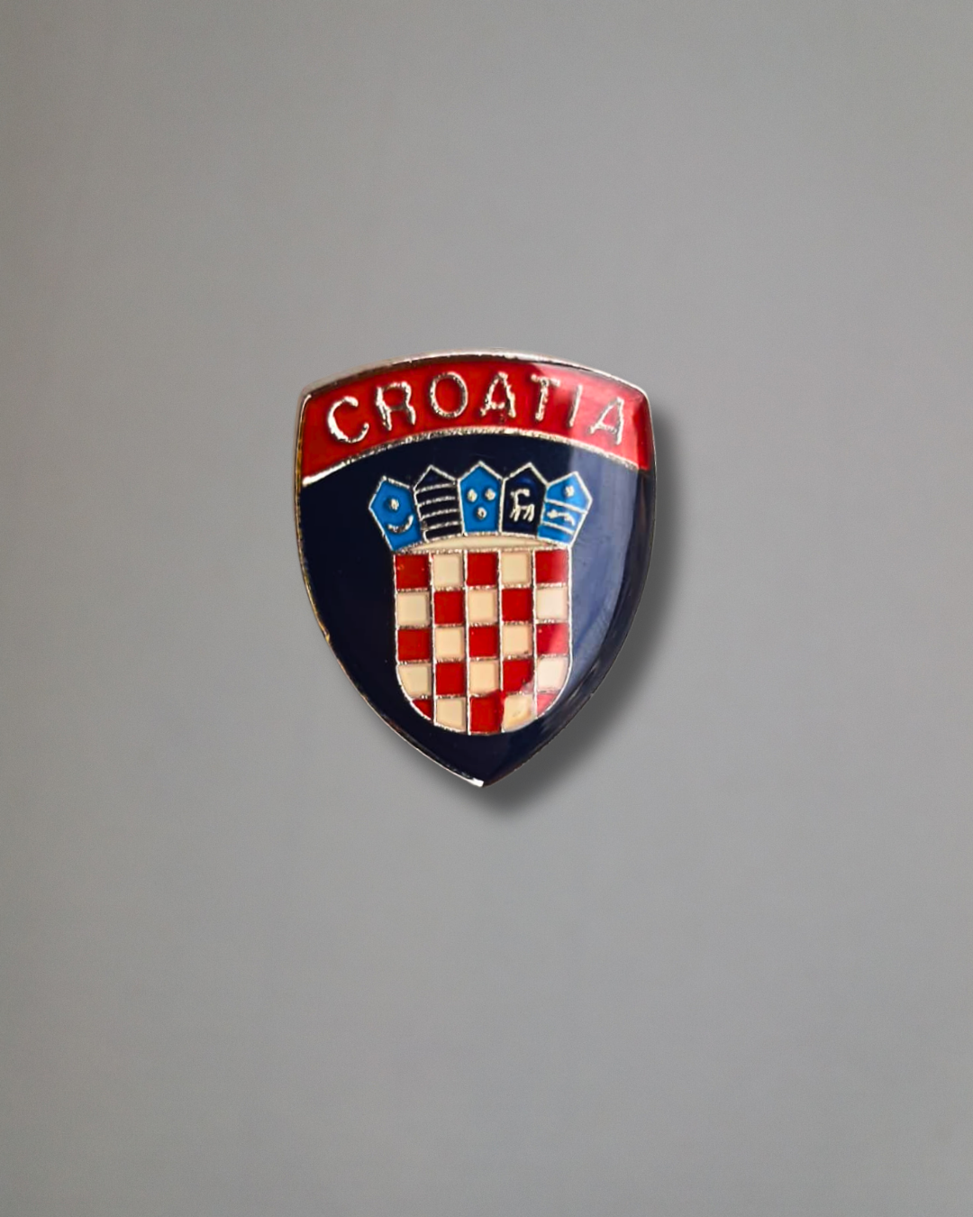 Metalna značka s natpisom Croatia i hrvatskim grbom.